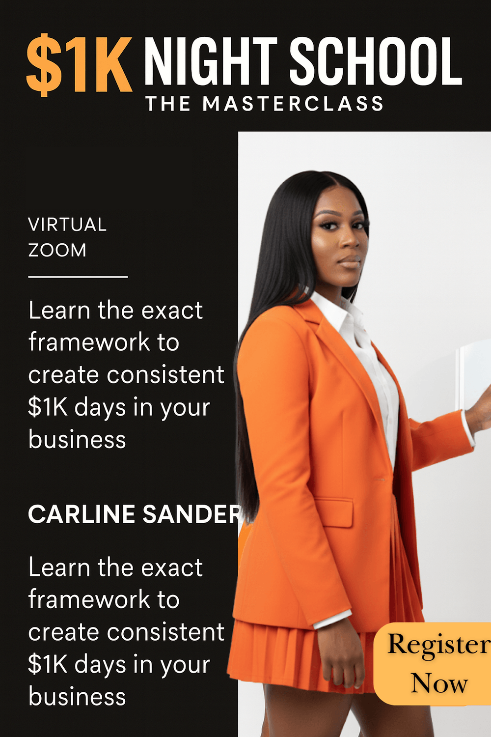 Join Carline Sanders for $1K Night School Masterclass, a masterclass where youâll learn the exact framework and implementation to start creating $1K days in your business.